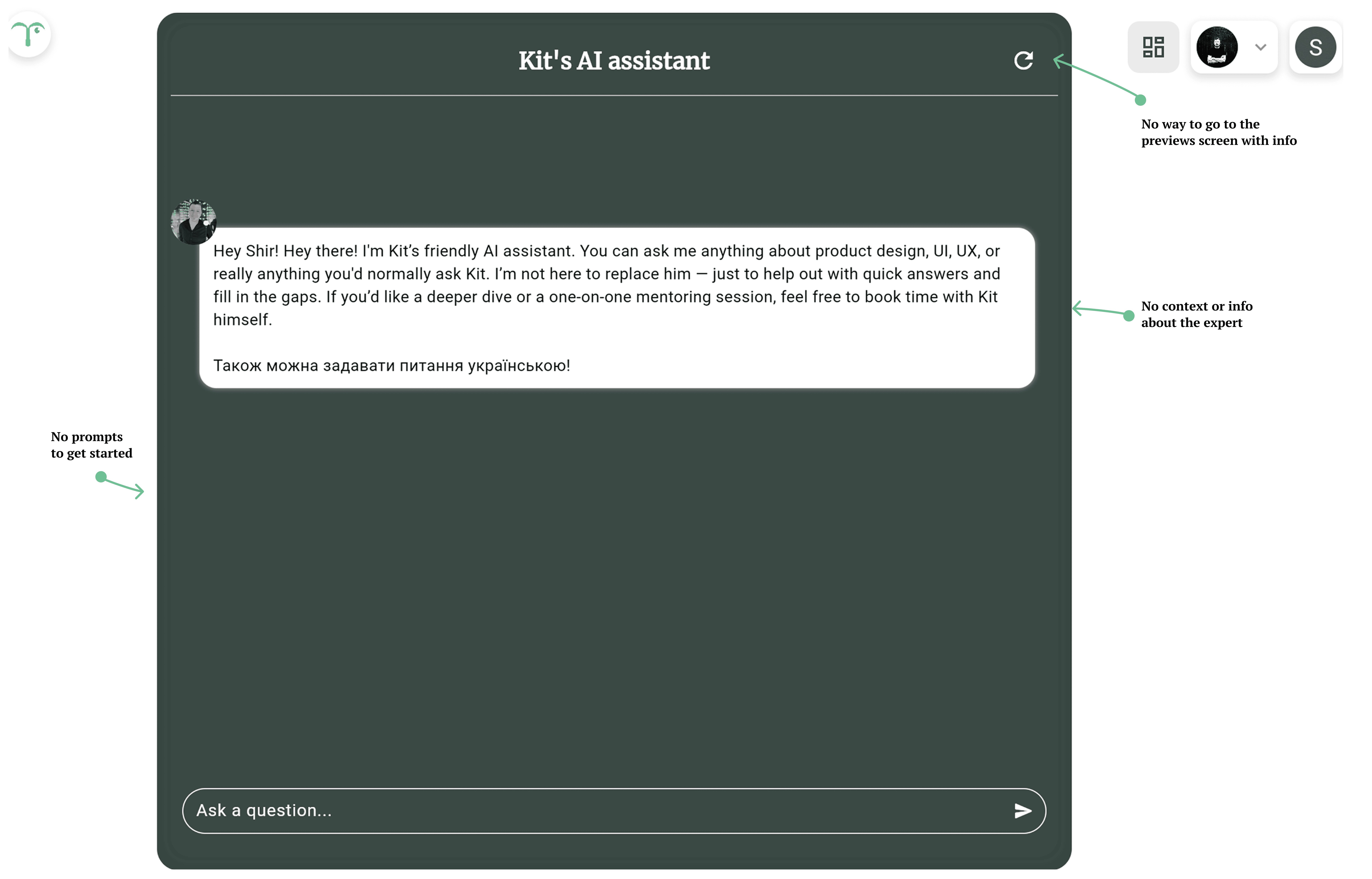 During the process, I identified a key issue in the chat interaction: low engagement caused by a lack of context, as chats with the AI expert occurred in isolation.