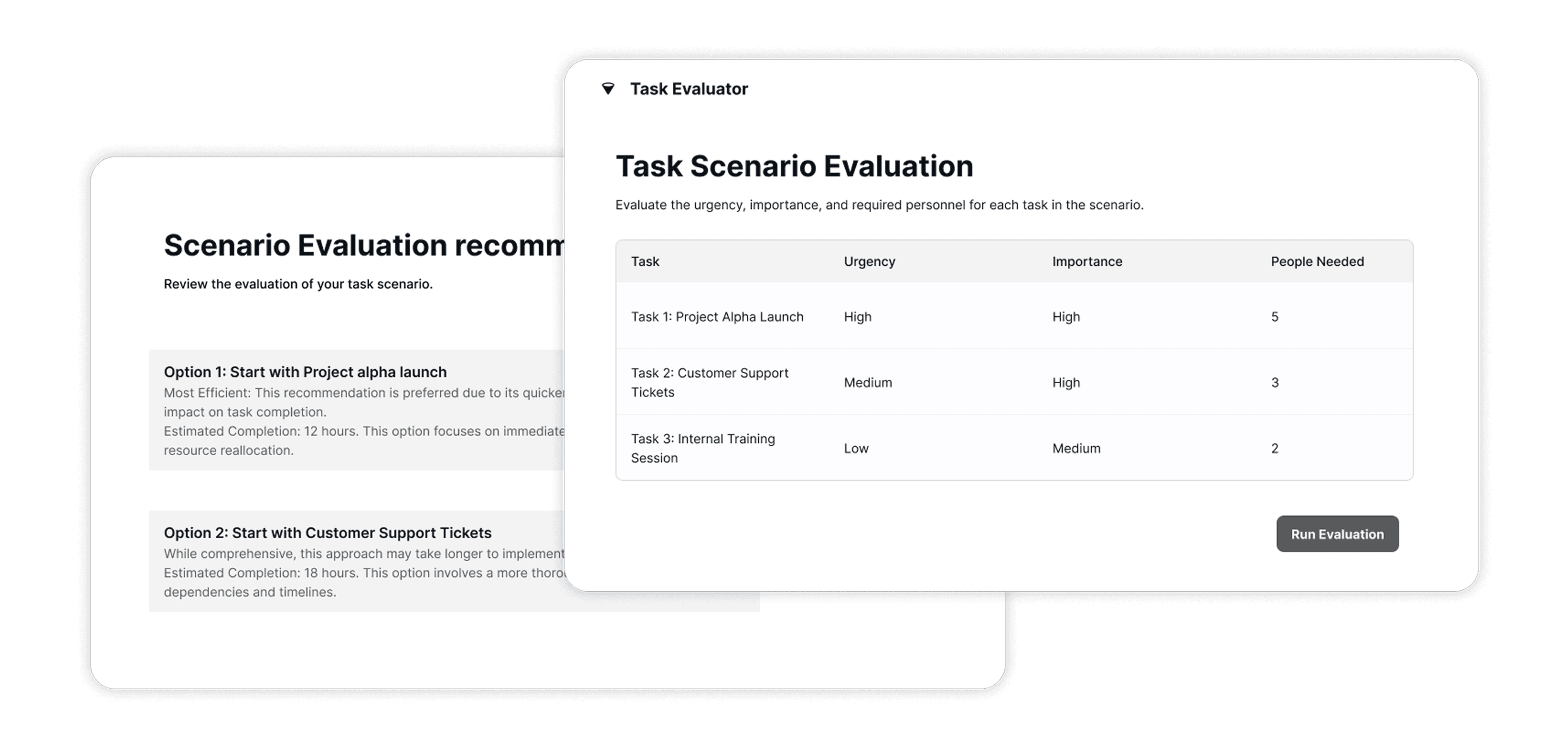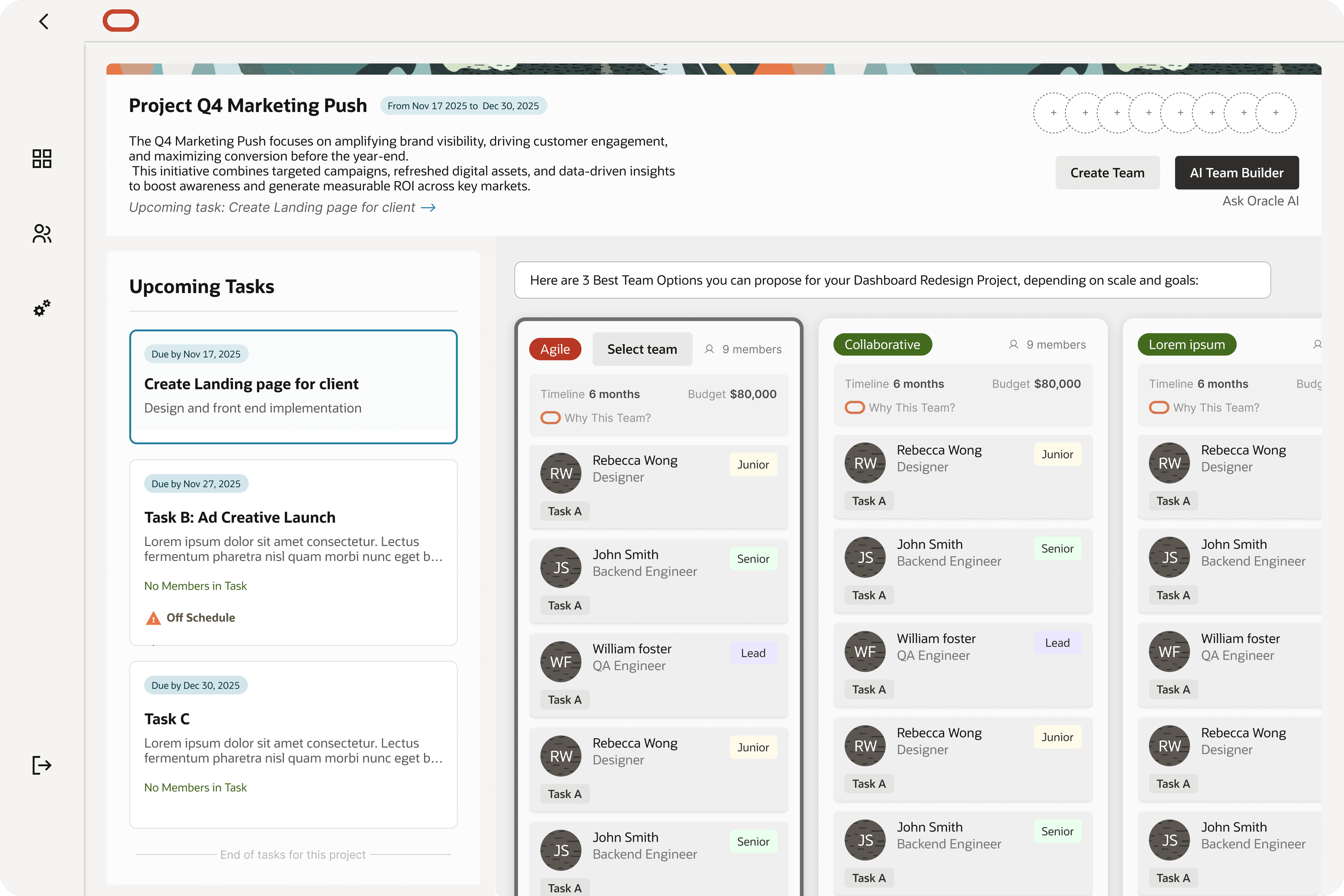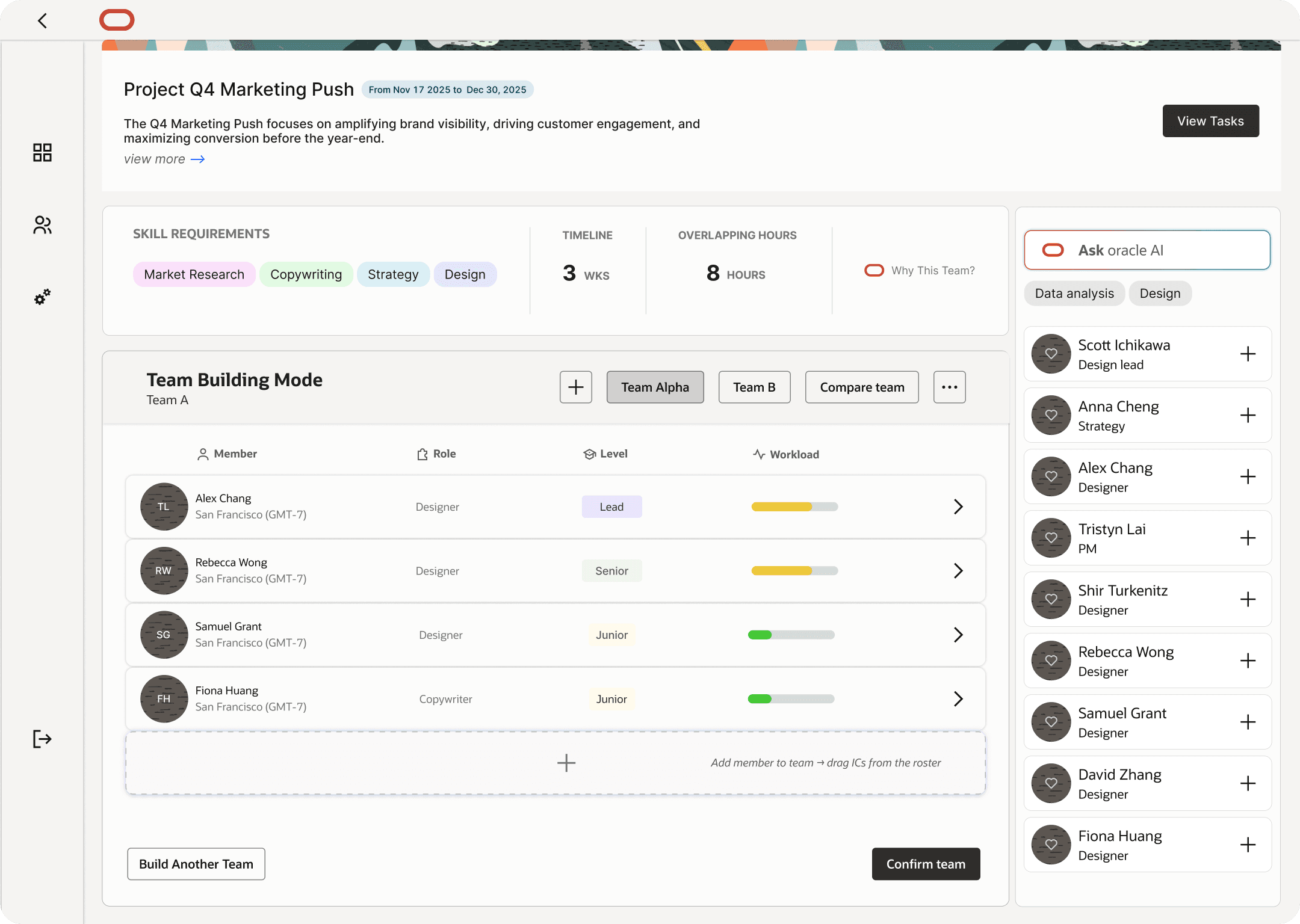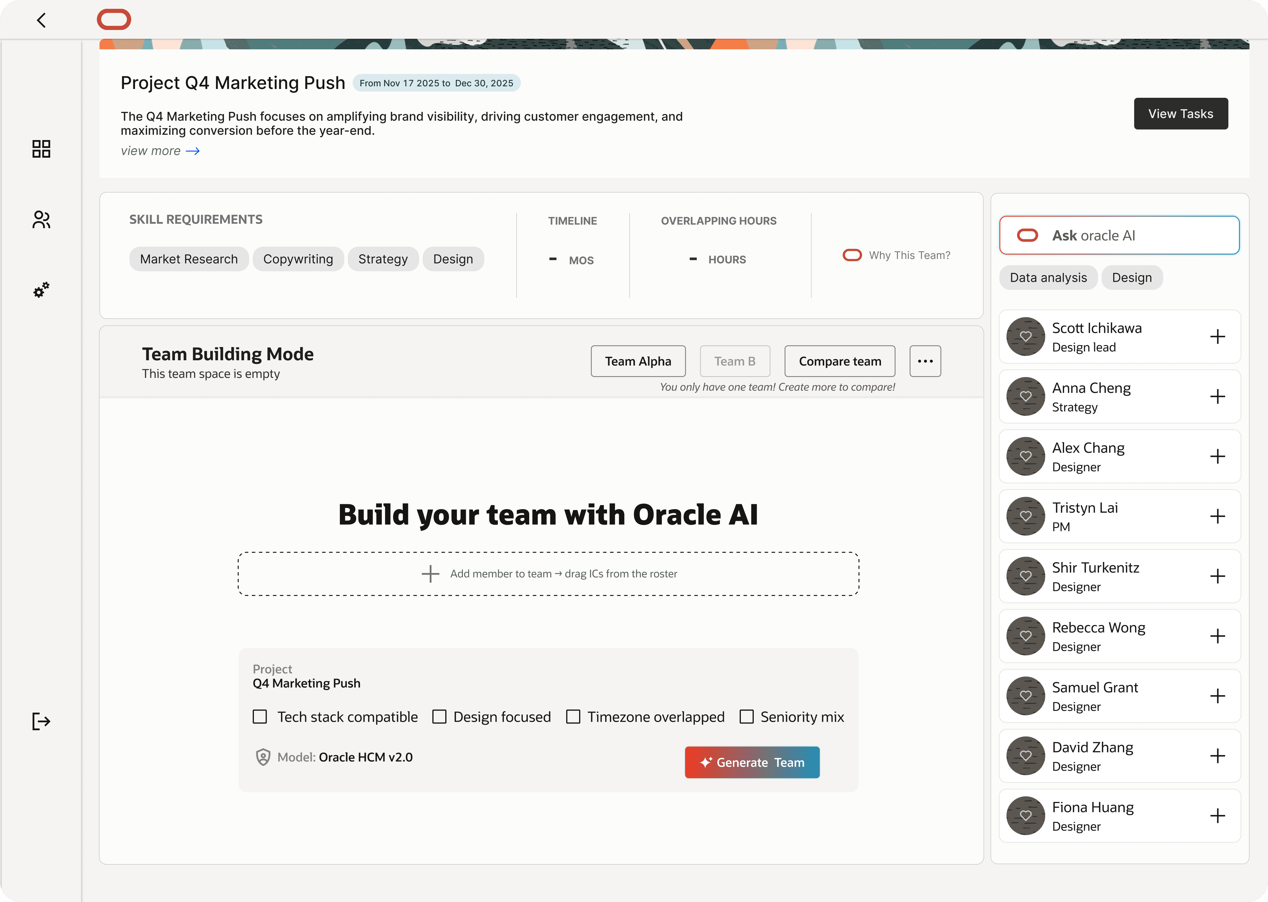 This hybrid flow allows managers to quickly generate team suggestions with a single click, then adjust them as needed. Providing multiple team options and clear signals of what came from AI versus manual edits keeps the process transparent, while fully editable outputs ensure managers maintain control over every decision.