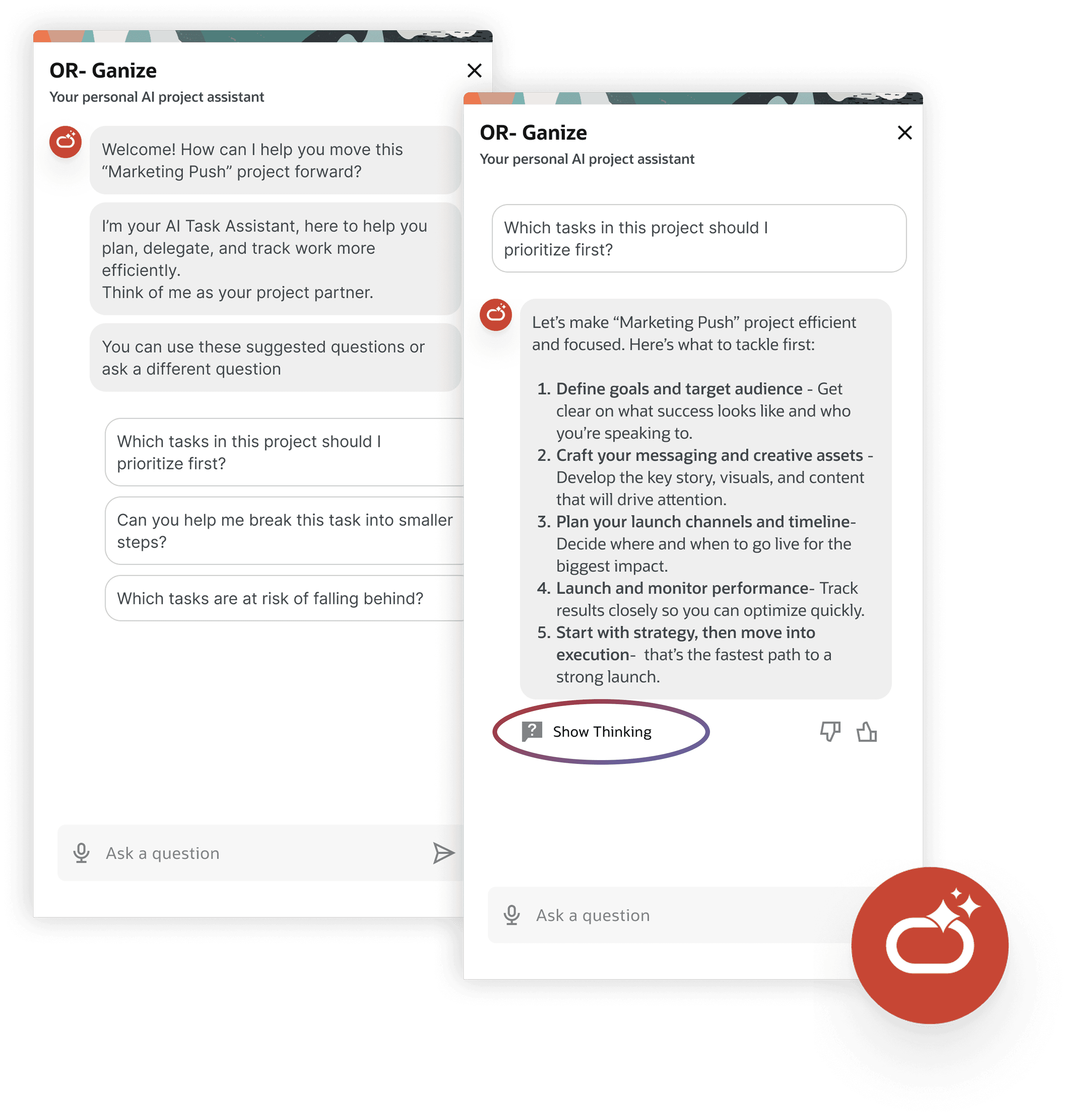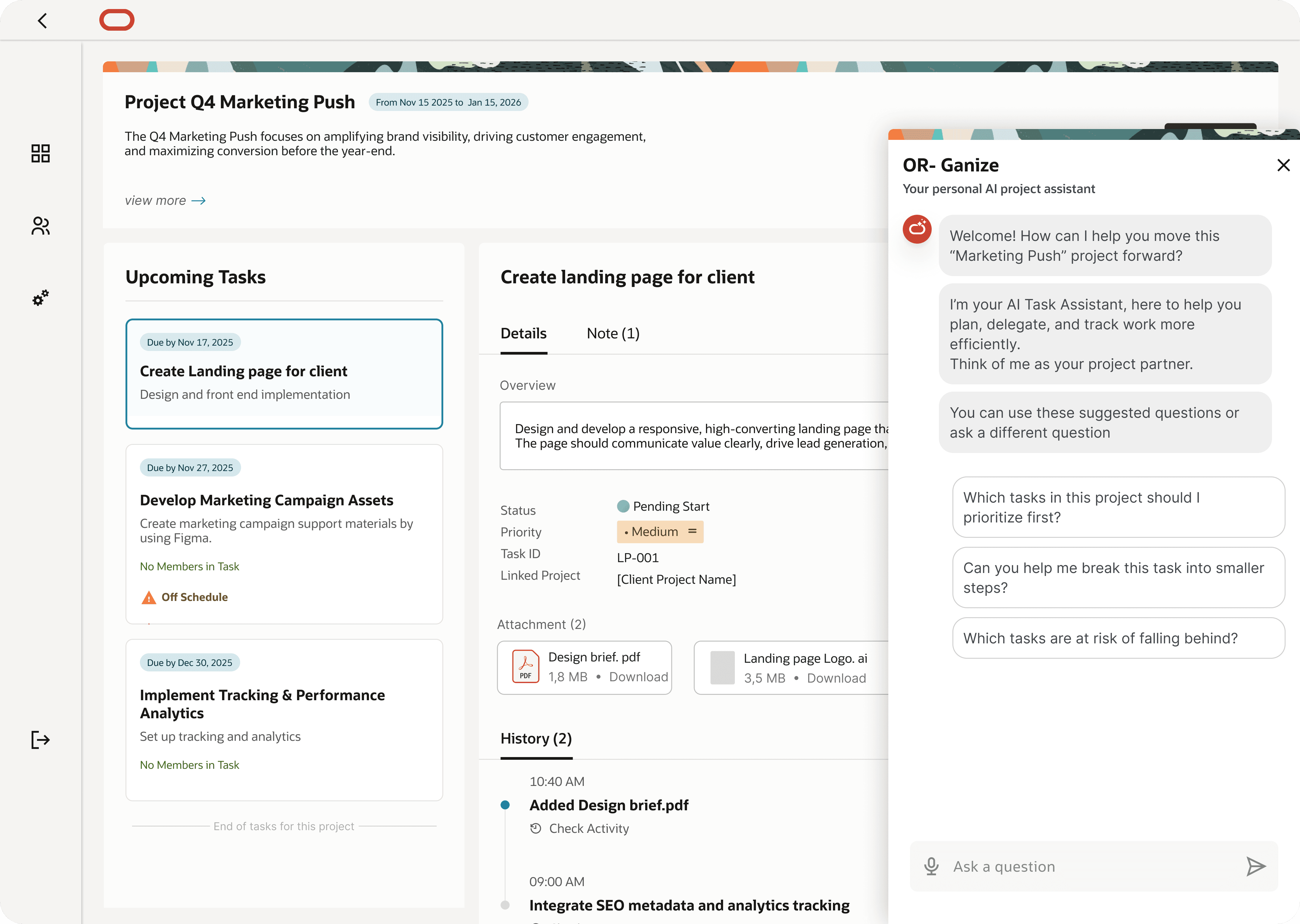 An always-on AI assistant helps answer project questions, explain risks, and surface quick insights using simple chat prompts. By showing how it reaches conclusions and prioritizing actionable signals over noise, it builds trust without adding complexity. Managers can edit and refine every output, keeping AI supportive, not in charge.
