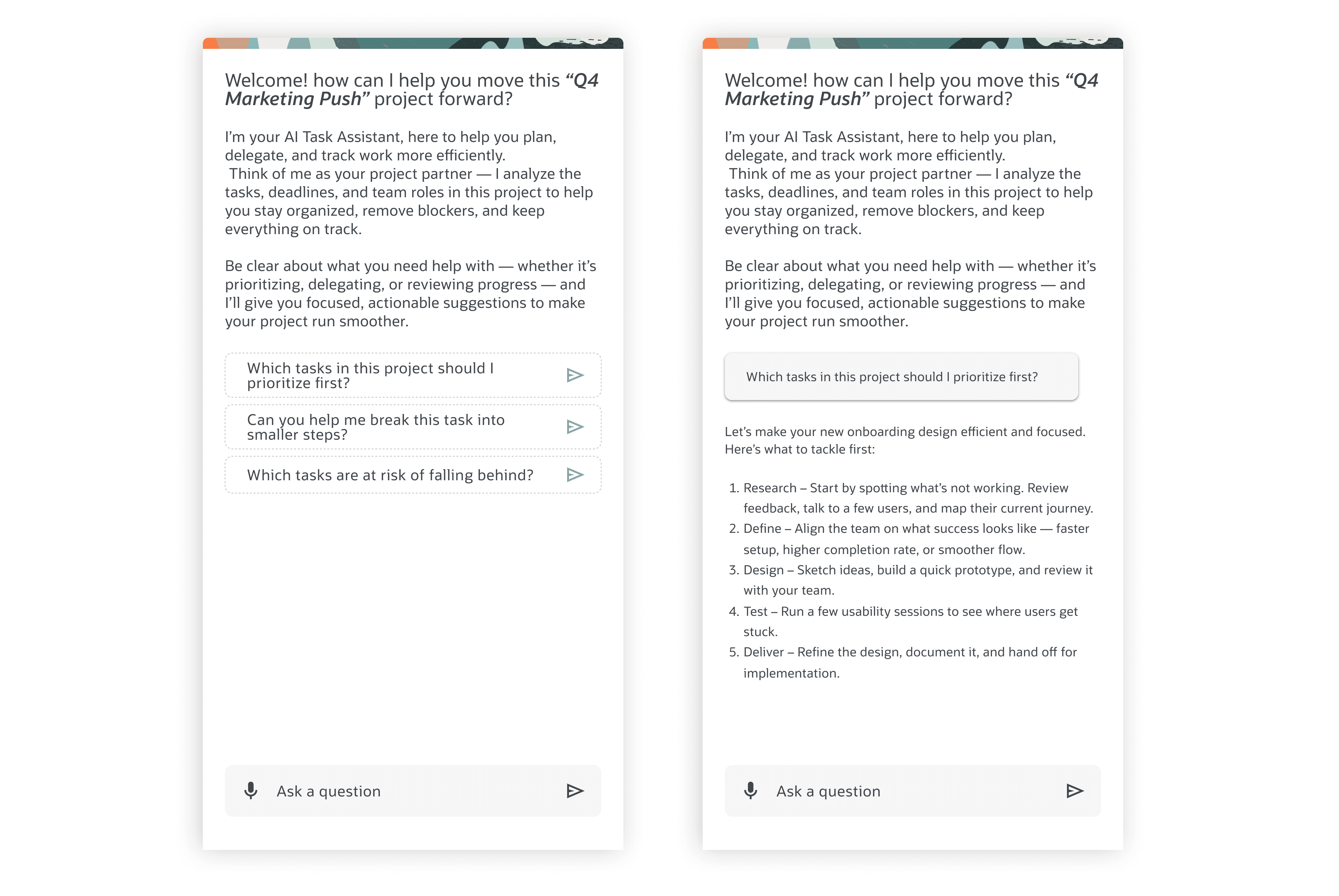 Initially, after the user research, we designed a scenario predictor for tasks, but shifted to an AI agent that managers can ask questions whenever they’re unsure about a project.